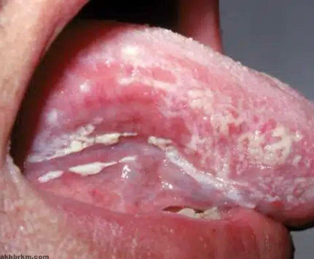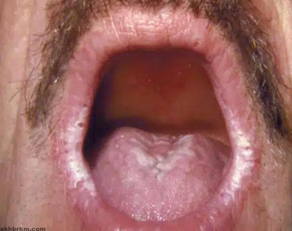 -بقع بيضاء أو صفراء على اللسان،الحنك،أو جوانب الفم.