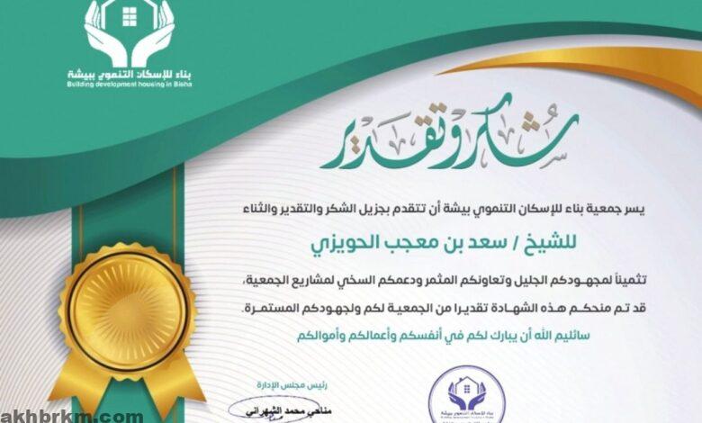 جمعية بناء للإسكان التنموي ببيشة تشكر الشيخ سعد بن معجب الحويزي على دعمه السخي