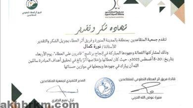 كرّمت جمعية المتقاعدين بالمدينة المنورة وفريق إثراء العطاء الإعلامية نوره كمال، وذلك خلال حفل أقيم بحضور المدير التنفيذي الأستاذ تركي…