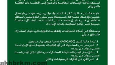 أصدر نادي الإبل قرارًا بإلزام المشارك تركي بن سعود بن نايف آل حثلين بدفع غرامة مالية قدرها خمسة ملايين ريال…