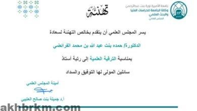 أصدر المجلس العلمي بجامعة الأميرة نورة بنت عبدالرحمن موافقته على ترقية الدكتورة حمده بنت عبدالله الفرائضي إلى درجة أستاذ “بروفيسور”…