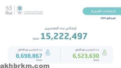 أظهرت بيانات الهيئة العامة للإحصاء أن إجمالي عدد المعتمرين خلال الربع الأول من عام 2025 بلغ 15,222,497 معتمرًا.وبحسب الإحصاءات، بلغ…