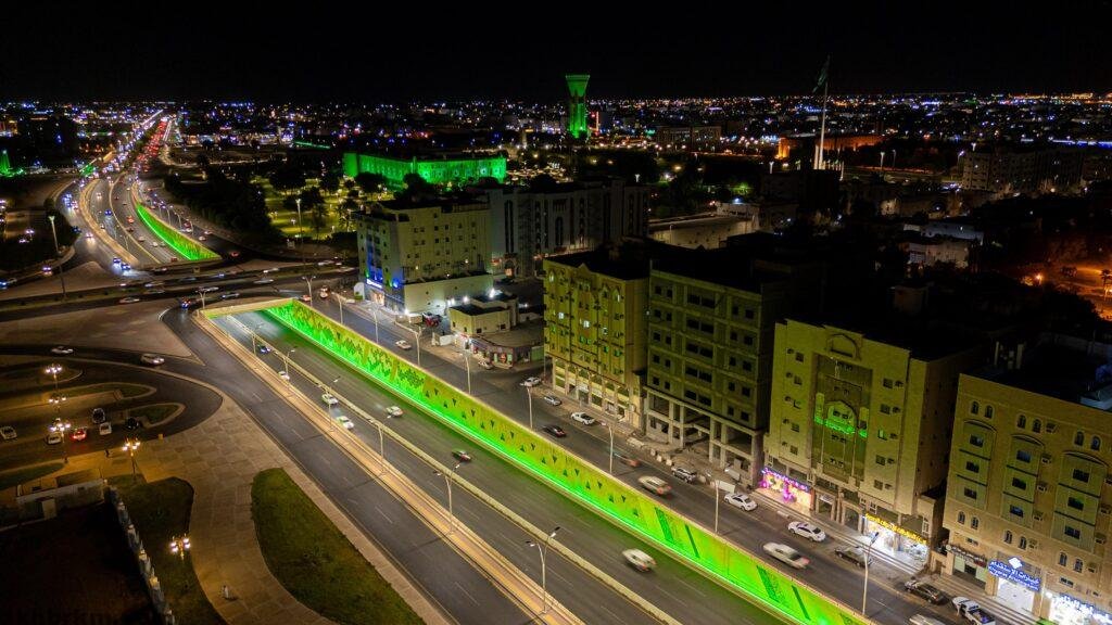 وأوضحت الأمانة أنها أكملت تنفيذ مظاهر الاحتفاء في الطرق والحدائق والميادين، حيث توشحت مدينة تبوك ومحافظاتها ومراكزها بـ 8000 علم وأكثر من 65,476 مترًا طوليًا من أساور الزينة الخضراء على أعمدة الإنارة والأشجار، إلى جانب تشغيل 250 كشافًا ثابتًا لإنارة الجسور والأنفاق باللون والأخضر، كما تم نشر عبارات التهنئة والتبريكات بهذه المناسبة عبر أكثر من 40 شاشة ولافتة طرق.