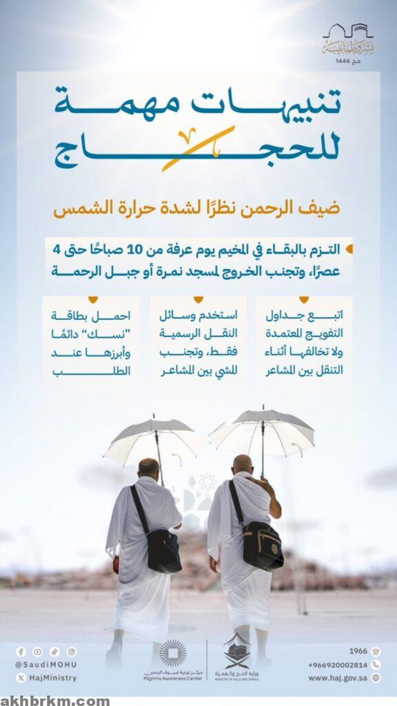 وأكدت الوزارة أن هذه التوصيات تأتي ضمن سلسلة إجراءات احترازية تهدف إلى تحقيق حج آمن ومنظّم في ظل الظروف المناخية الصعبة، مشددة على أهمية التقيّد بالتعليمات واتباع الإرشادات الميدانية لضمان سلامة الجميع.