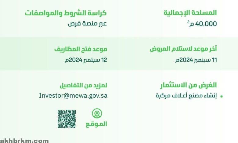 وأوضحت الوزارة أن الاستثمار في إنشاء مصانع الأعلاف المركّبة، يدعم قرارها السابق بإيقاف زراعة الأعلاف الخضراء؛ للمحافظة على الموارد المائية للمياه الجوفية، مبينة أن آخر موعد لاستلام عروض الفرصة الاستثمارية، هو 11 سبتمبر 2024م، فيما سيتم فتح المظاريف بتاريخ 12 سبتمبر 2024م.
