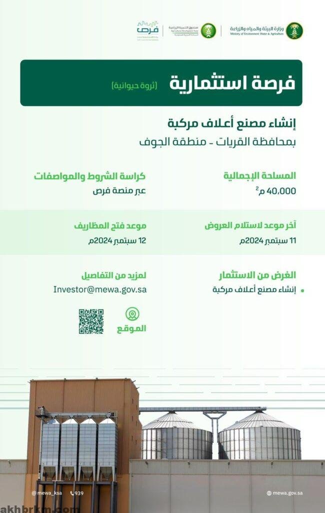أعلنت وزارة البيئة والمياه والزراعة عن طرح فرصة استثمارية، لإنشاء مصنع أعلاف مركّبة على مساحة إجمالية تبلغ (40) ألف متر مربع، في محافظة القريات بمنطقة الجوف؛ بهدف رفع كفاءة الإنتاج الحيواني، وتحقيق الاكتفاء الذاتي من الأعلاف.
