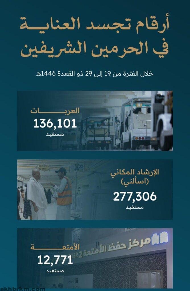 أرقام تعكس جهود العناية الفائقة بالحرمين الشريفين خلال الفترة من 19 إلى 29 ذو القعدة 1446هـ