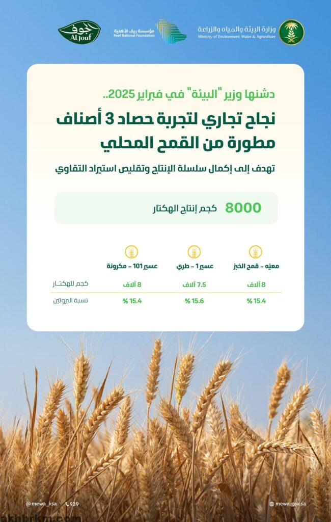 كشفت وزارة البيئة والمياه والزراعة، عن تحقيق نجاح تجاري لتجربة حصاد ثلاثة أصناف مطورة من القمح المحلي، دشّنها معالي وزير البيئة والمياه والزراعة المهندس عبد الرحمن بن عبد المحسن الفضلي في فبراير الماضي، بإنتاج بلغ (8000) كيلو جرام للهكتار، وذلك ضمن جهود الوزارة لتطوير أصناف محلية تتلاءم مع البيئة المحلية؛ لزيادة الإنتاج المحلي، والمساهمة في تحقيق مستهدفات الأمن الغذائي.