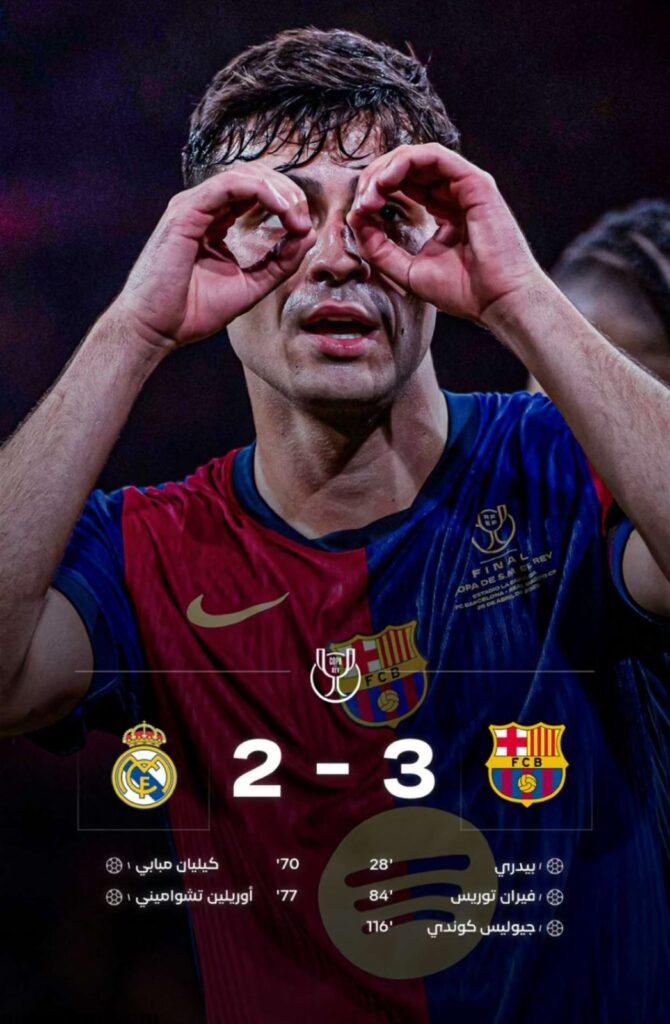 في ليلة كلاسيكية حافلة بالإثارة، حسم فريق برشلونة لقب كأس ملك إسبانيا بعد فوزه المثير على غريمه التقليدي ريال مدريد بنتيجة 3-2، في المباراة التي جمعتهما مساء اليوم.