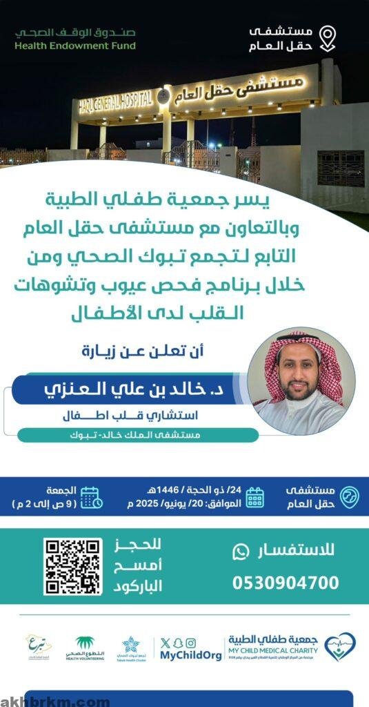 ضمن المبادرات الصحية الهادفة للوصول إلى الفئات الأكثر احتياجًا، تُطلق جمعية طفلي الطبية، وبدعم من صندوق الوقف الصحي، وبالشراكة مع مستشفى حقل العام التابع لـ تجمع تبوك الصحي، زيارة طبية تطوعية متخصصة، يقدّمها الدكتور خالد العنزي – استشاري قلب أطفال، وذلك يوم الجمعة 20 يونيو 2025، في إطار برنامج “الاستشاري المتطوع الزائر”.