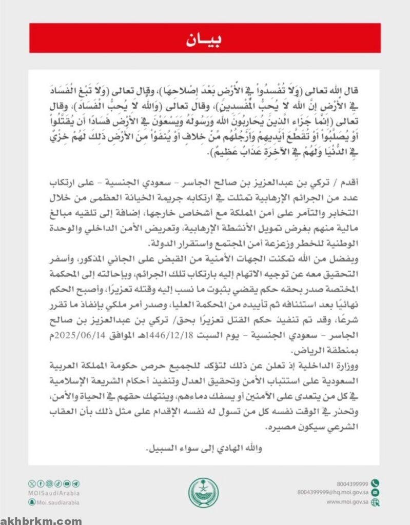 أعلنت وزارة الداخلية أنه في يوم السبت 18 ذو الحجة 1446هـ الموافق 14 يونيو 2025م، تم تنفيذ حكم القتل تعزيرًا بحق المواطن تركي بن عبدالعزيز بن صالح الجاسر – سعودي الجنسية – بعد ثبوت إدانته بارتكاب جرائم تمس أمن الدولة، أبرزها الخيانة العظمى من خلال التعاون والتخابر مع جهات معادية، وتلقي مبالغ مالية للإضرار بأمن المملكة واستقرارها.
