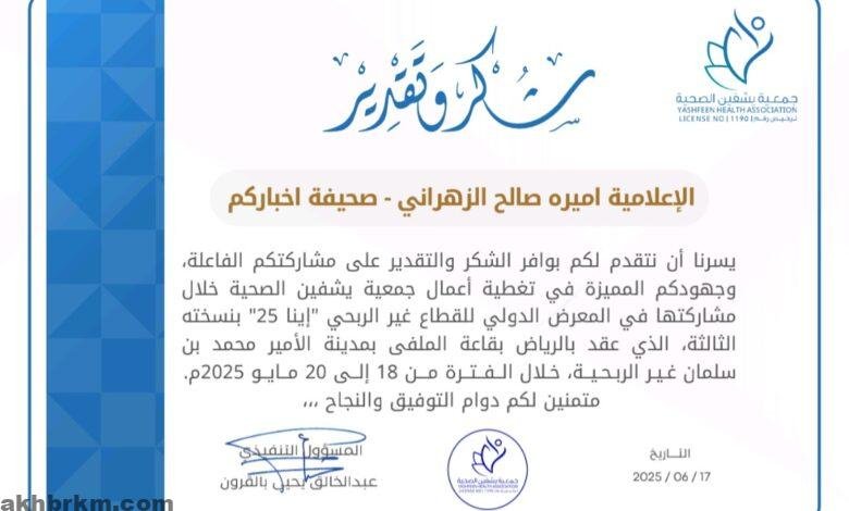 جمعية “يشفين الصحية” تكرم الإعلامية أميرة الزهراني لمشاركتها الفاعلة في تغطية معرض “إينا 25”