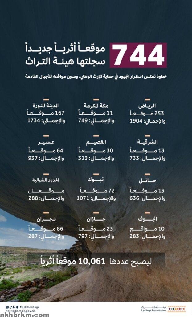 أعلنت هيئة التراث عن تسجيل 744 موقعًا أثريًا جديدًا في مختلف مناطق المملكة، ضمن جهودها المستمرة لحماية الإرث الوطني وصون مواقعه للأجيال القادمة، ليصل إجمالي المواقع الأثرية المسجلة رسميًا إلى 10,061 موقعًا حتى الآن.