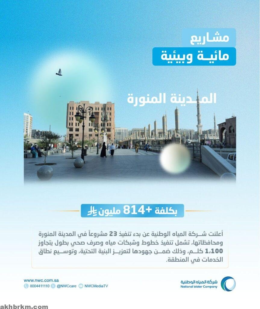 أعلنت شركة المياه الوطنية – ممثلة بالقطاع الشمالي الغربي – عن البدء في تنفيذ 23 مشروعًا مائيًا وبيئيًا في مواقع متفرقة من منطقة المدينة المنورة، بكلفة تتجاوز 814 مليون ريال، وذلك في إطار جهودها لتوسيع نطاق الخدمة، ورفع الكفاءة التشغيلية، والارتقاء بجودة خدمات العملاء، بما يتماشى مع مستهدفات رؤية المملكة 2030.
