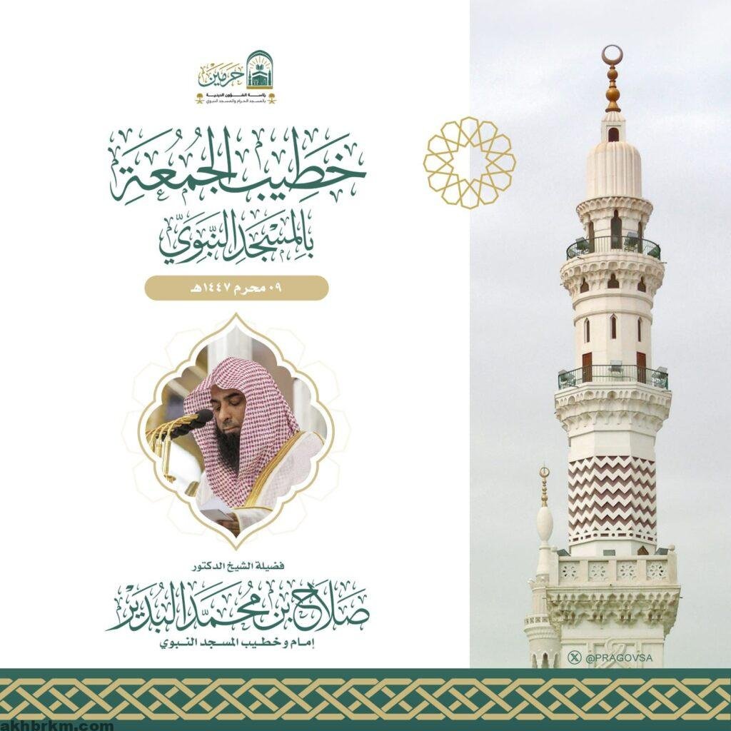 أعلنت رئاسة الشؤون الدينية بالمسجد الحرام والمسجد النبوي عن أسماء أئمة و خطباء صلاة الجمعة يوم 9 محرم 1447هـ وذلك ضمن الجدول الدوري لإمامة وخطابة الحرمين الشريفين.