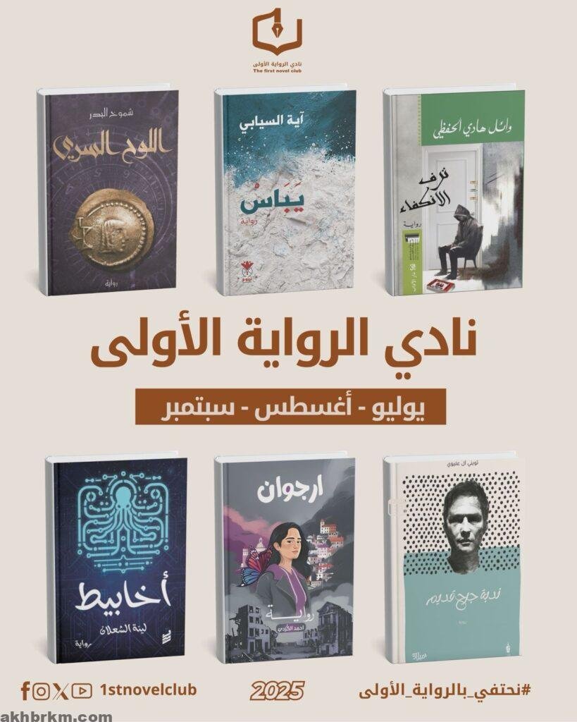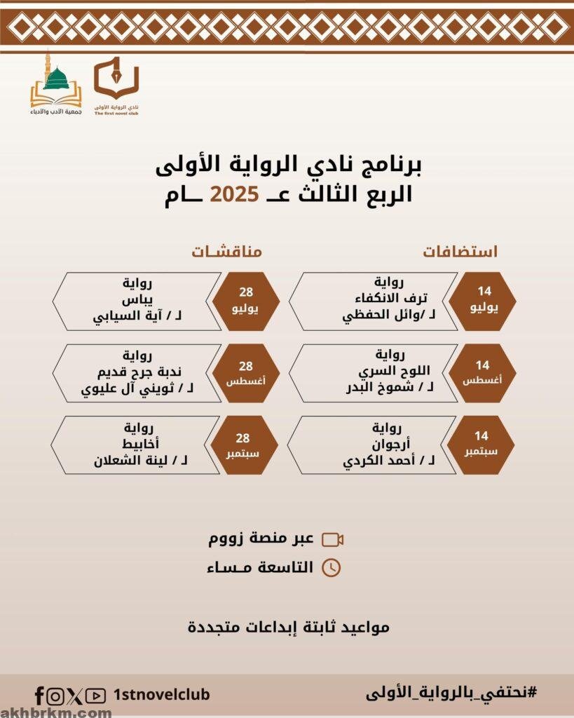 أعلن نادي الرواية الأولى عن انطلاق برنامجه الثقافي للربع الثالث من عام 2025، والذي يتضمّن سلسلة من اللقاءات الأدبية والنقاشات النقدية، تُقام افتراضياً عبر منصة “زووم” عند الساعة التاسعة مساءً، وذلك في مواعيد ثابتة تُعقد في يومي 14 و28 من كل شهر.