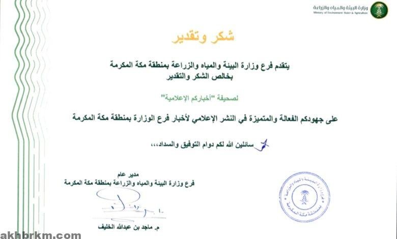 كرّم فرع وزارة البيئة والمياه والزراعة بمنطقة مكة المكرمة ممثلاً بسعادة المدير العام المهندس ماجد بن عبدالله الخليف صحيفة “أخباركم” تقديرًا لجهودها الفعّالة والمتميزة في التغطية الإعلامية لأخبار ومناشط الفرع بالمنطقة.