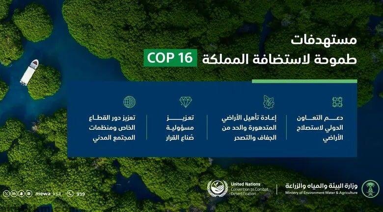 مستهدفات طموحة تقودها المملكة العربية السعودية من خلال استضافة مؤتمر الرياض “COP16” ، للعمل من أجل تعزيز التعاون بين (197) دولة موقعة على اتفاقية الأمم المتحدة لمكافحة التصحر، وحشد الإمكانات للبحث عن الحلول الفعالة لإعادة تأهيل ملايين الهكتارات من الأراضي المتدهورة والحد من الجفاف،