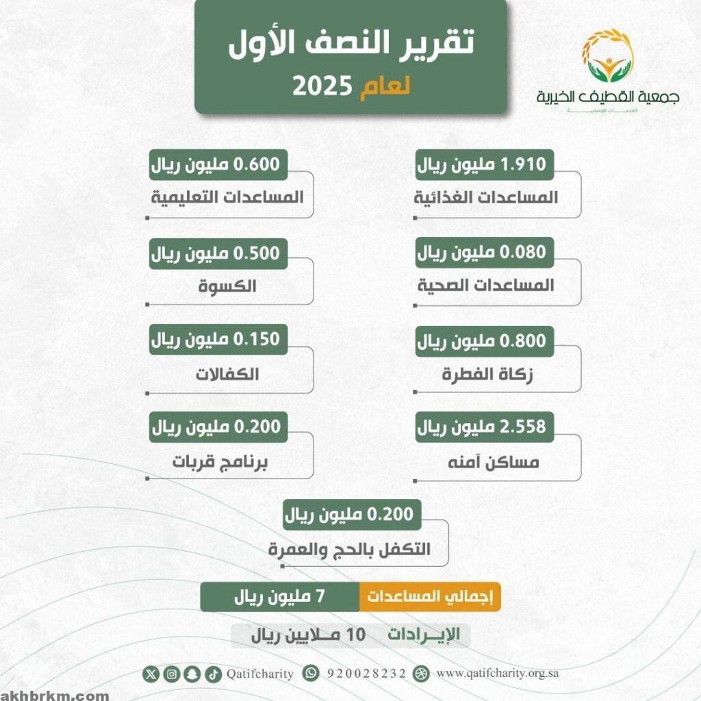 القطيف الخيرية: مساعدات بأكثر من 7 ملايين ريال خلال النصف الأول من 202510 ملايين ريال مجموع الإيرادات في الفترة ذاتها