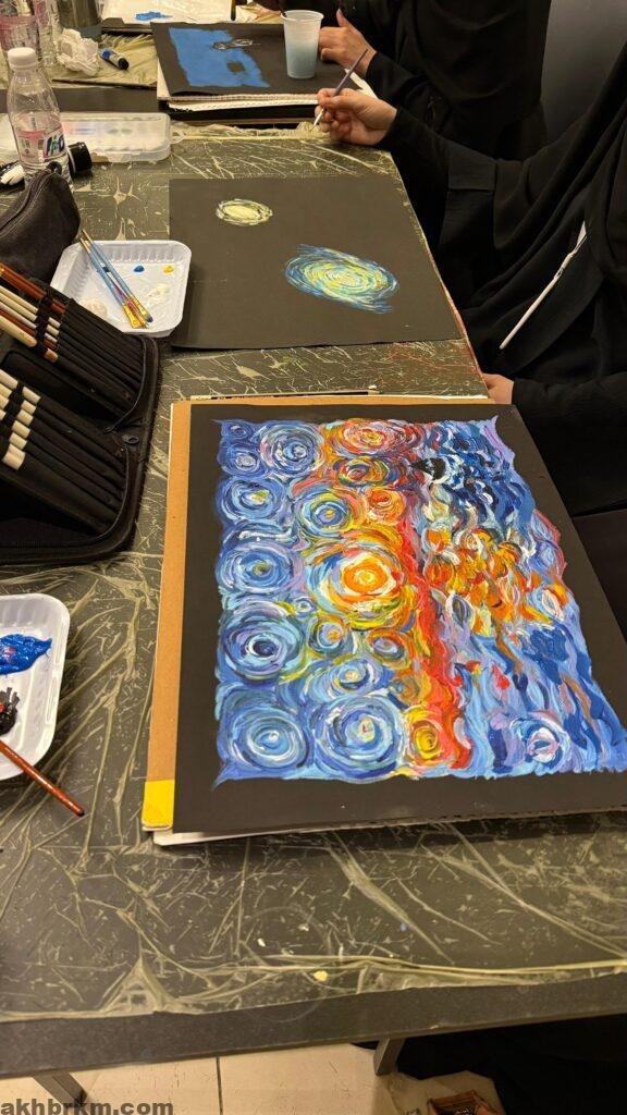 وتخلّلت الورشة تطبيقات عملية وجلسات تفاعلية، مكّنت المشاركين من استكشاف أسلوب فان جوخ المميز بالحركة اللونية الجريئة والملامس التعبيرية الغنية، مما أضفى طابعًا فنيًا ملهمًا على أجواء الورشة.