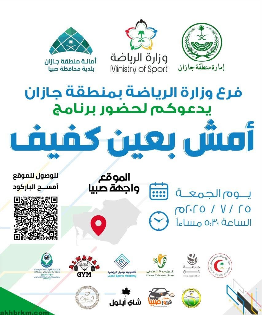 بلدية صبيا تنفذ مبادرة “امش بعين كفيف” بالشراكة مع فرع وزارة الرياضة مساء غدٍ الجمعة