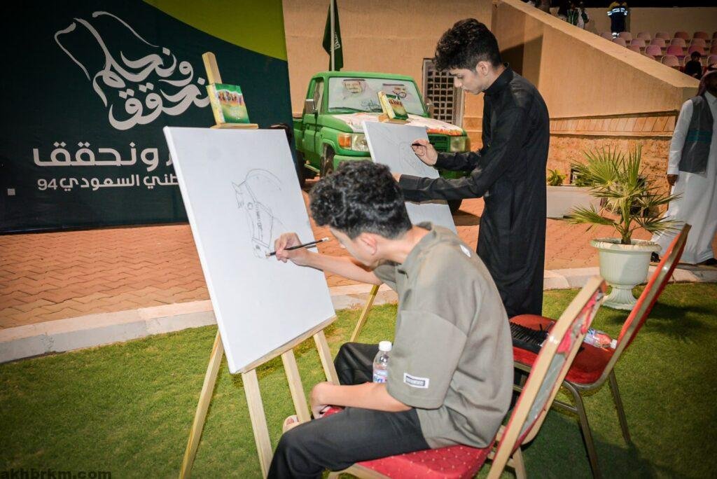 وشملت الفعاليات المقامة على لوحة فنية تعبيرية للتعبير عن مشاعر وحب الوطن وكذلك العديد من الأركان للفن التشكيلي وركن المرسم الحر والرسم المباشر وركن الطفل وركن الأسر المنتجة والحرفية بالإضافه إلى فعاليات المسرح المتنوعة والعروض الشعبية و أوبريت غنائي بعنوان (نحلم ونحقق ) وفيلم وثائقي إلى جانب فعاليات الأطفال وفرق الأطفال الإنشادية وعروض الخيل ومسيرة شاركت فيها الجهات الحكوميه والقطاعات الخاصة، والمسابقات ،والجوائز المتنوعة، وعروض الدمى طيلة فترة الاحتفال ؛بالإضافة لتوزيع ٥٠٠ وردة ،والكثير من الهدايا المقدمة للمواطنين والمقيمين ،وإطلاق ٩٤ بالونة في فضاء الاحتفال .