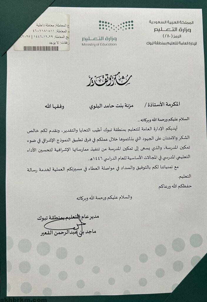 تعليم تبوك يكرّم الإعلامية مزنة البلوي لجهودها في تطبيق النموذج الإشرافي المدرسي