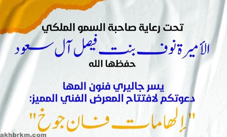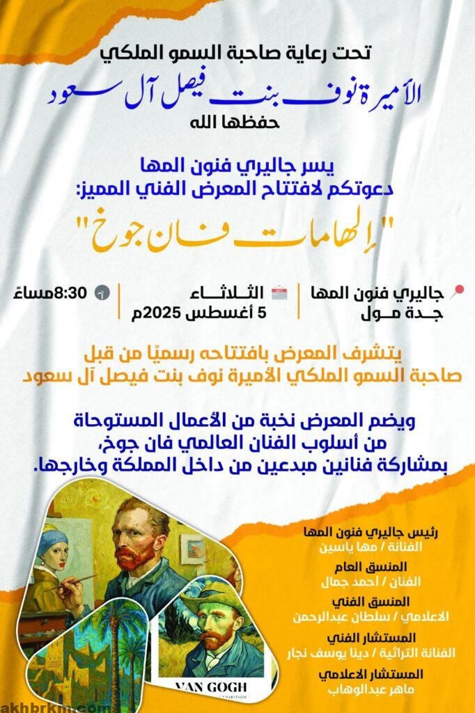 برعاية كريمة من صاحبة السمو الملكي الأميرة نوف بنت فيصل آل سعود – حفظها الله –، يُقام المعرض التشكيلي المتميز “إلهامات فان جوخ”، بتنظيم جاليري فنون المها، وذلك يوم الثلاثاء 5 أغسطس 2025م، في معرض جاليري فنون المها بـ جدة مول، عند الساعة 8:30 مساءً.