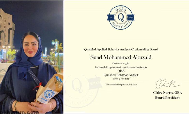 الدكتورة سعاد أبو زيد تحصل على اعتماد QBA في تحليل السلوك التطبيقي