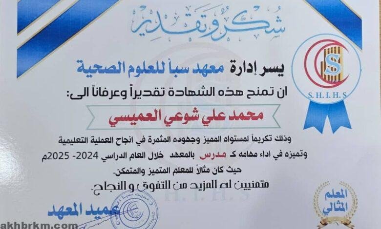 عميد معهد سبأ يكرم الأستاذ محمد نبراس العميسي لتميزه في الأداء التعليمي خلال العام الدراسي 2024-2025.