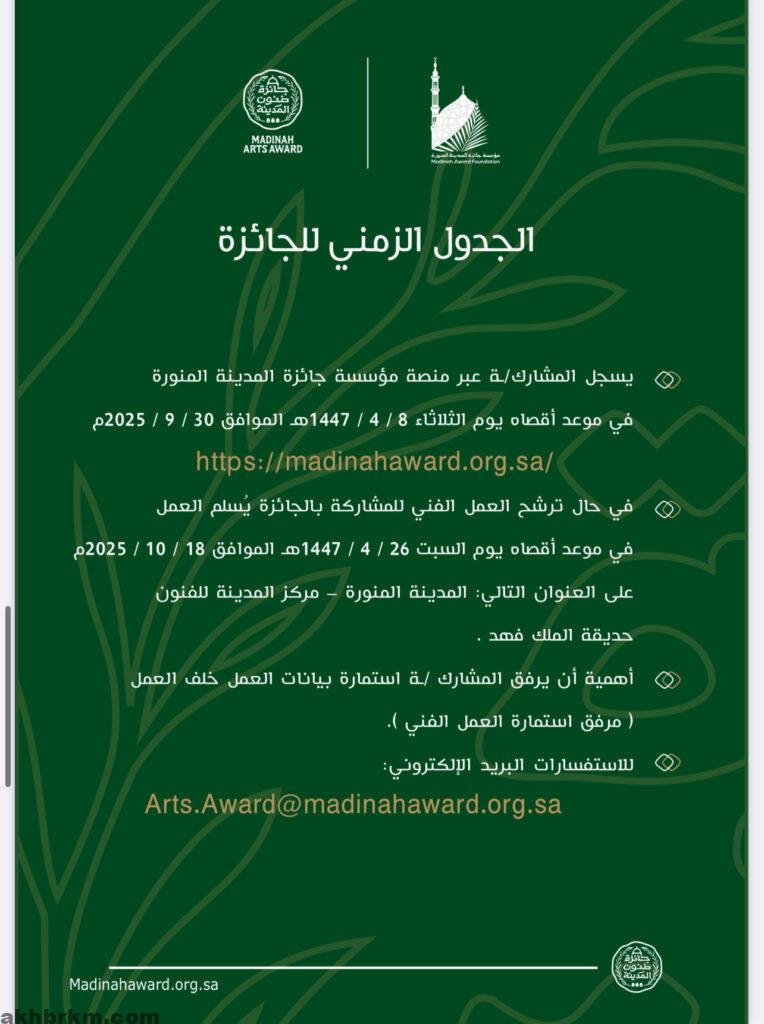 انطلاق التسجيل في “جائزة فنون المدينة” بدورتها الأولى لعام 2025 لإبراز مكانة المدينة المنورة ثقافيًا وفنيًا