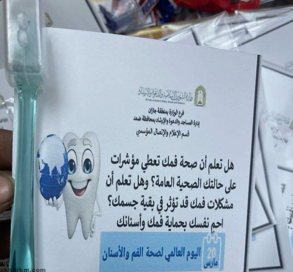 قدمت إدارة إدارة المساجد والدعوة والإرشاد بمحافظة ضمد مبادرة توعوية تثقيفية تزامنا مع اليوم العالمي لصحة الفم والأسنان حثت فيها الحضور والمجتمع عموما على ضرورة الحفاظ على سلامة الأسنان والعناية بصحة الفم وذلك من خلال توزيع المنشورات التي تهدف إلى توضيح طريقة العناية بالفم والأسنان والاستخدام السليم لها كما وزعت الفرش ومعاجين الأسنان