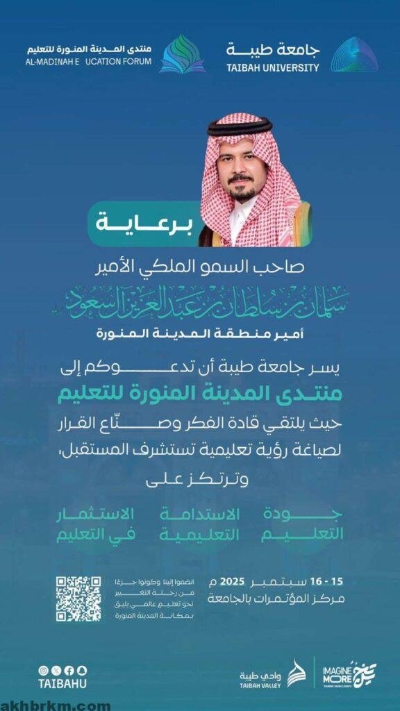 تحت رعاية صاحب السمو الملكي الأمير سلمان بن سلطان بن عبدالعزيز، أمير منطقة المدينة المنورة، تنظّم جامعة طيبة منتدى المدينة المنورة للتعليم، وذلك خلال الفترة من 15 – 16 سبتمبر 2025م في مركز المؤتمرات بالجامعة.