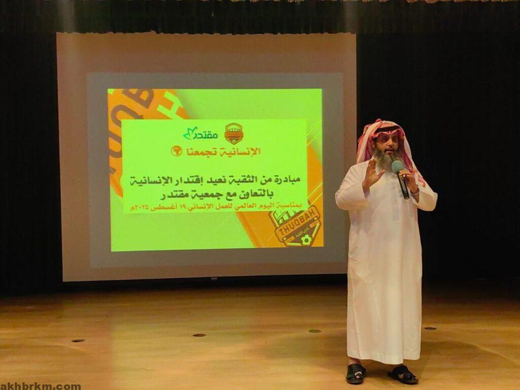 نفذ نادي الثقبة الرياضي مبادرة مجتمعية متميزة بعنوان “من الثقبة نعيد اقتدار الإنسانية” بالتعاون مع جمعية مقتدر لرعاية و تأهيل الأحداث بمناسبة اليوم العالمي للعمل الإنساني وذلك تحت إشراف مدير المسؤولية المجتمعية بالنادي أ. عائشة الناجم، وبالتنسيق مع عضو مجلس إدارة جمعية مقتدر أ.عيده القحطاني، وبدعم من رئيس النادي أ.الوليد الصياح والرئيس التنفيذي أ.خالد الصياح وتحت ترحيب رئيس جمعية مقتدر لرعاية وتأهيل الأحداث الدكتور مسند القحطاني.
