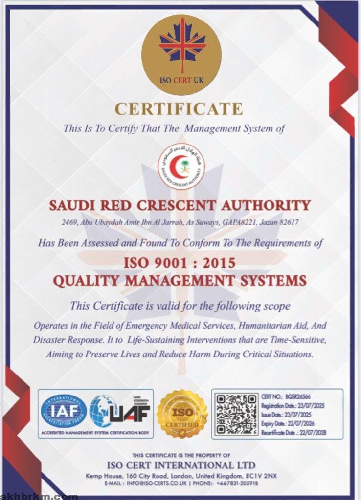 الهلال الأحمر بجازان يحقق التميز بحصوله على شهادة الاعتماد الدولي ISO 9001:2015″