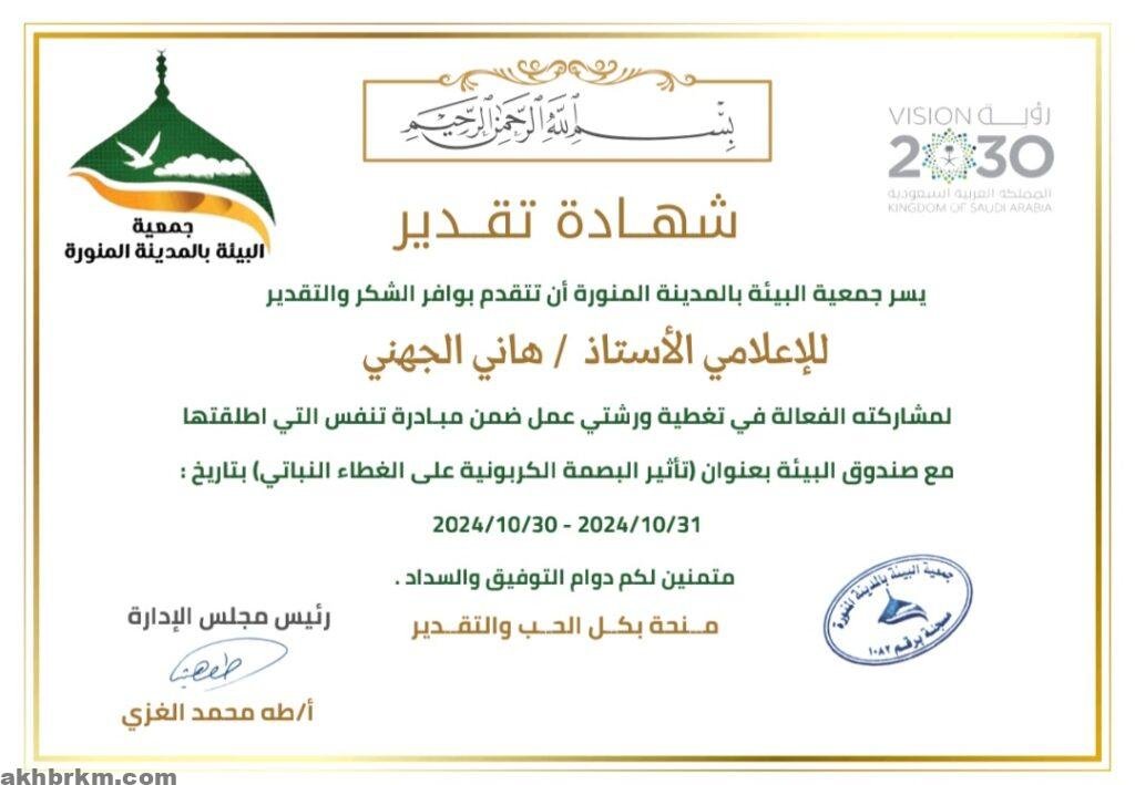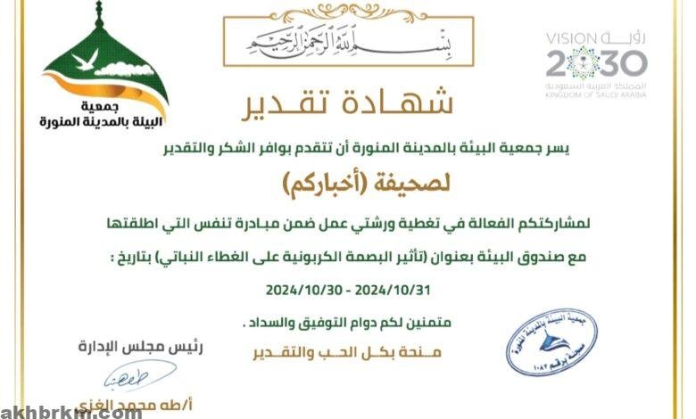 جمعية البيئة بالمدينة المنورة تكرم صحيفة “أخباركم” الإعلامية