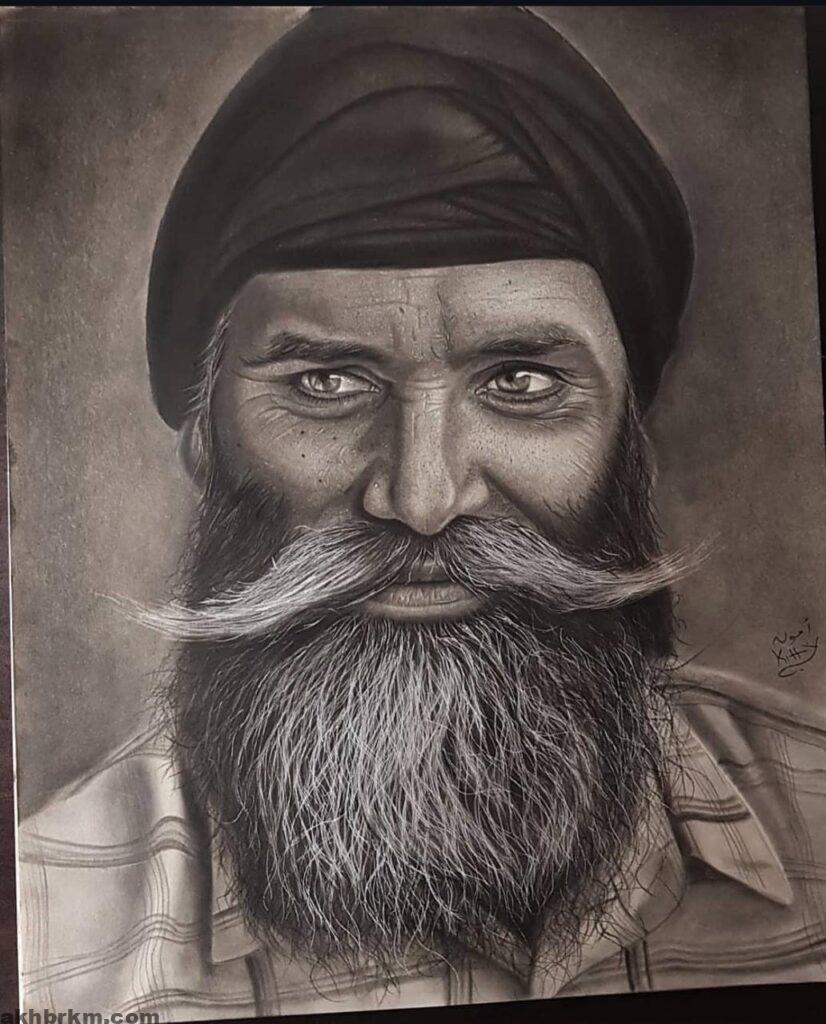 الشيب في اللحية والشوارب لم يكن بالنسبة لي مجرد لون بل رمز للخبرة والوقار حاولت أن أرسم كل خصلة كأنها حقيقية يمكن لمسها. حتى العمامة بطياتها والقميص بخطوطه الناعمة كلها رسمتها بعناية لأوصل إحساس الواقعية للمشاهد.