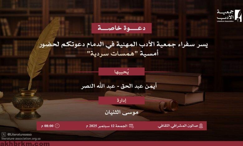 جمعية الأدب المهنية في الدمام تعلن عن أمسية «همسات سردية» بمشاركة نخبة من الأدباء