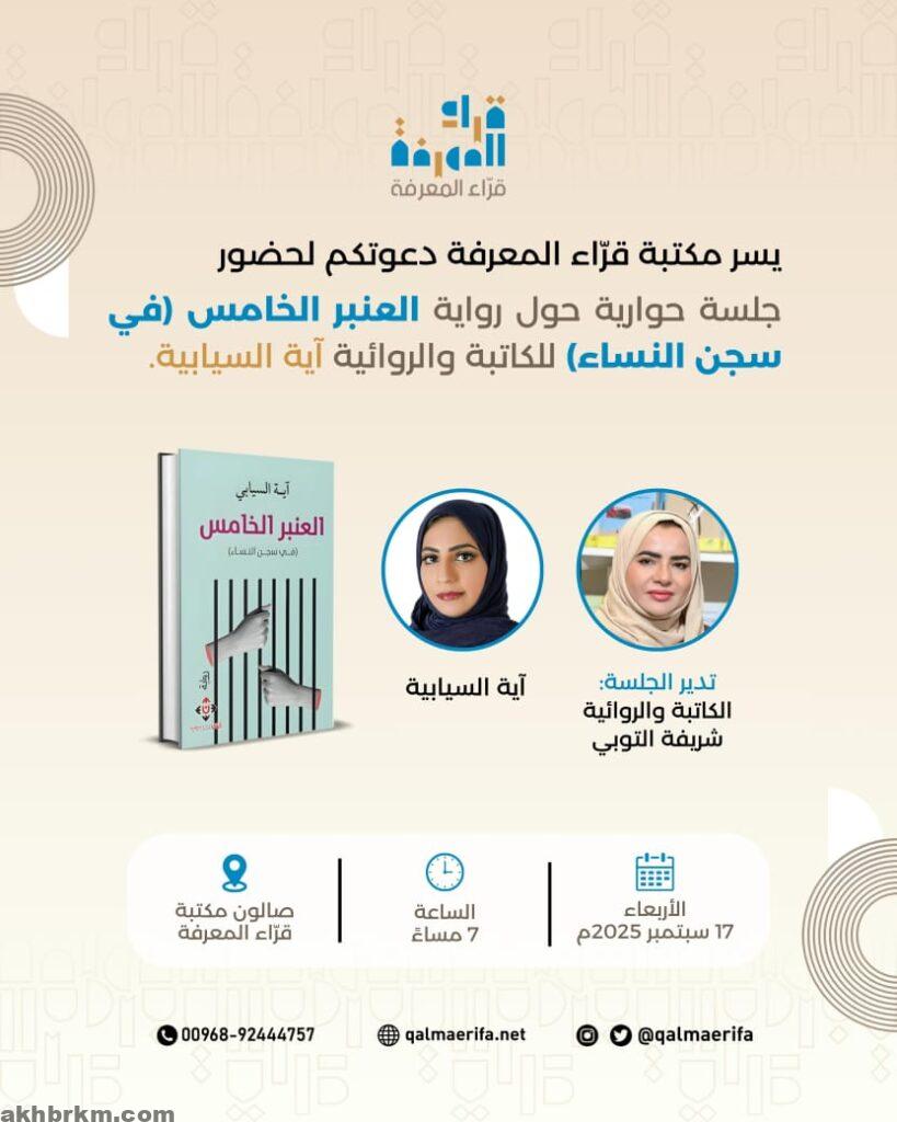 أعلنت مكتبة قرّاء المعرفة عن تنظيم جلسة حوارية مساء الأربعاء 17 سبتمبر 2025، لمناقشة رواية «العنبر الخامس-في سجن النساء» للكاتبة والروائية العمانية آية السيابية، وذلك عند الساعة السابعة مساءً في صالون المكتبة.