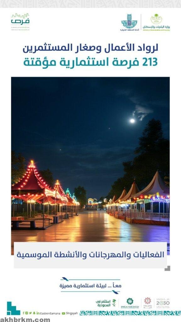 (كشفت أمانة المنطقة الشرقية، عن طرح 213 فرصة استثمارية مؤقتة، بمدة تتراوح من يوم واحد وحتى 6 أشهر، وذلك ضمن نموذج محفّز ومباشر يهدف إلى دعم رواد الأعمال وصغار المستثمرين، وذلك في خطوة تعكس الحراك الاستثماري المتسارع بالمنطقة الشرقية، وتشمل هذه الفرص مجالات متعددة مثل الفعاليات، المهرجانات، المخيمات، المطاعم، المقاهي، الألعاب، إضافة إلى الأنشطة المبتكرة والموسمية والبحرية، بما يعزز من الحركة الترفيهية والسياحية مع اعتدال الأجواء ومواسم الفعاليات.