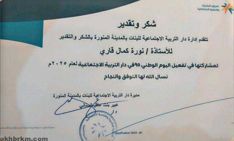 كرّمت إدارة دار التربية الاجتماعية للبنات في المدينة المنورة، الإعلامية نوره كمال قاري من صحيفة أخباركم الإعلامية، تقديرًا لمشاركتها الفاعلة وجهودها الإعلامية المتميزة في تغطية فعاليات اليوم الوطني السعودي الـ95، الذي أُقيم مؤخرًا في مقر الدار لعام 2025.