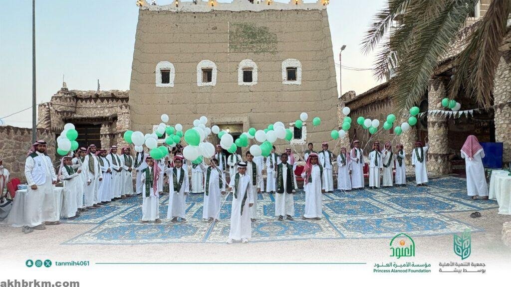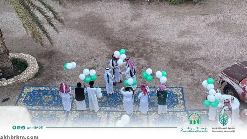 تخلل الاحتفاء فعاليات وطنية متنوعة شارك فيها الأبناء بلباسهم التقليدي وحضورهم المميز، كما أُطلقت البالونات الخضراء والبيضاء ابتهاجًا بهذه المناسبة الغالية، ليجسد الجميع معاني الولاء والانتماء لوطن العز والمجد.