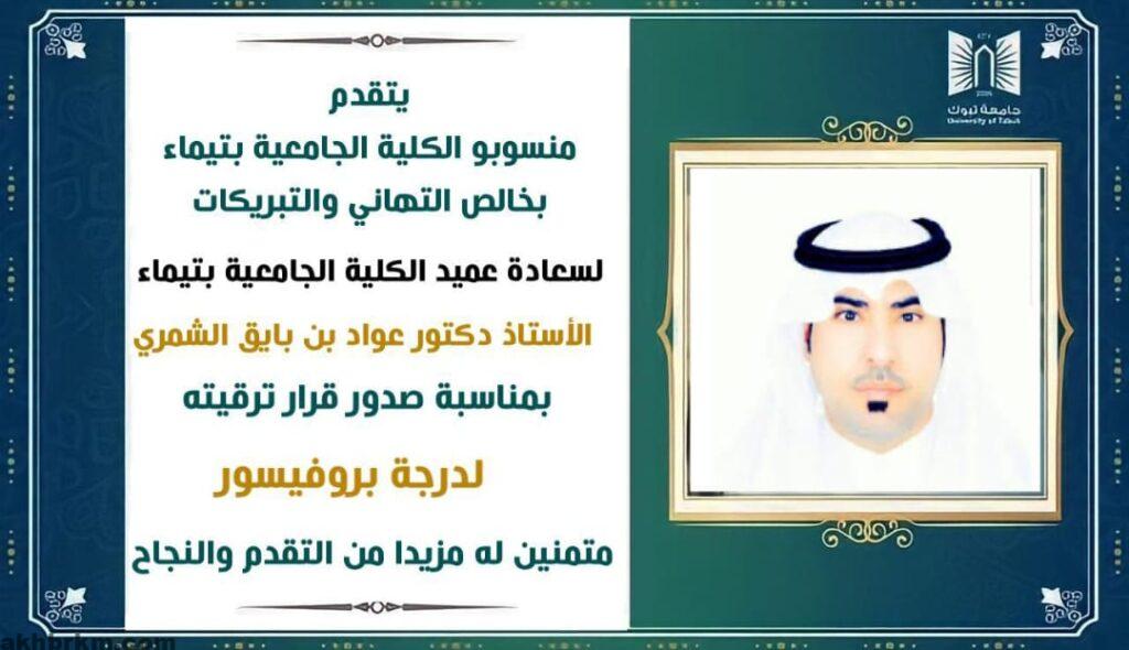 صدر قرار بترقية سعادة عميد الكلية الجامعية بتيماء الأستاذ الدكتور عواد بن بايق الشمري إلى درجة بروفيسور، وذلك تقديرًا لجهوده المتميزة في مجالات البحث العلمي وخدمة التعليم الجامعي.