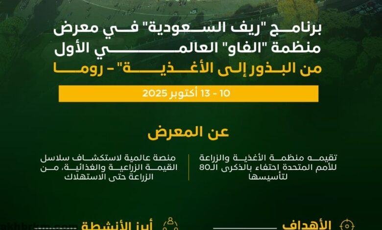 تشارك المملكة العربية السعودية، ممثلة في برنامج التنمية الريفية الزراعية المستدامة “ريف السعودية”، في المعرض العالمي الأول لمنظمة الأغذية والزراعة للأمم المتحدة “فاو” بعنوان “من البذور إلى الأغذية”، الذي تستضيفه العاصمة الإيطالية روما في باركو دي بورتا كابينا، خلال الفترة من 10 إلى 13 أكتوبر 2025؛ وذلك ضمن جهود المملكة لتعزيز مكانتها الريادية عالمياً في دعم وتطوير القطاع الزراعي المستدام، ودعم صغار المزارعين، والترويج للمنتجات الريفية في الأسواق الدولية.