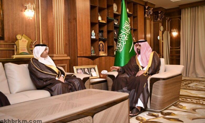 استقبل صاحب السمو الملكي الأمير محمد بن عبدالعزيز بن محمد بن عبدالعزيز، أمير منطقة جازان، بمكتبه اليوم، الرئيس التنفيذي لشركة تجمع مطارات الثاني المهندس علي بن محمد المسرحي، يرافقه مدير عام مطار الملك عبدالله الدولي الأستاذ مبارك بن محمد الشهراني، وذلك بحضور صاحب السمو الأمير ناصر بن محمد بن عبدالله بن جلوي، نائب أمير المنطقة.
