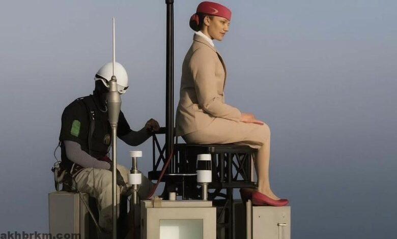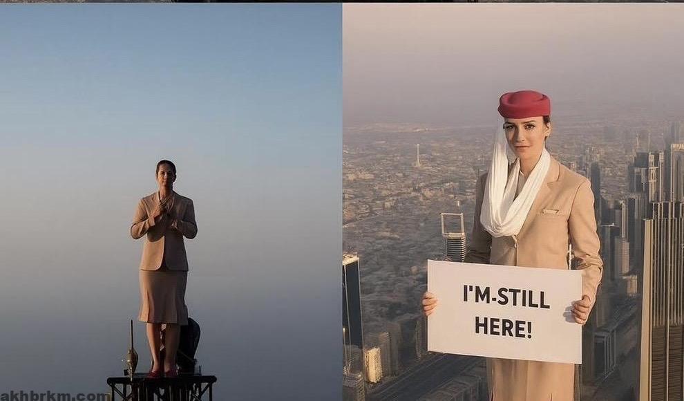 لامرأة ترتدي زيّ مضيفة طيران تقف بثبات مدهش فوق قمة برج خليفة، أعلى مبنى في العالم بارتفاع 828 مترًا، أي ما يعادل ثلاث مرات ارتفاع برج إيفل تقريبًا!