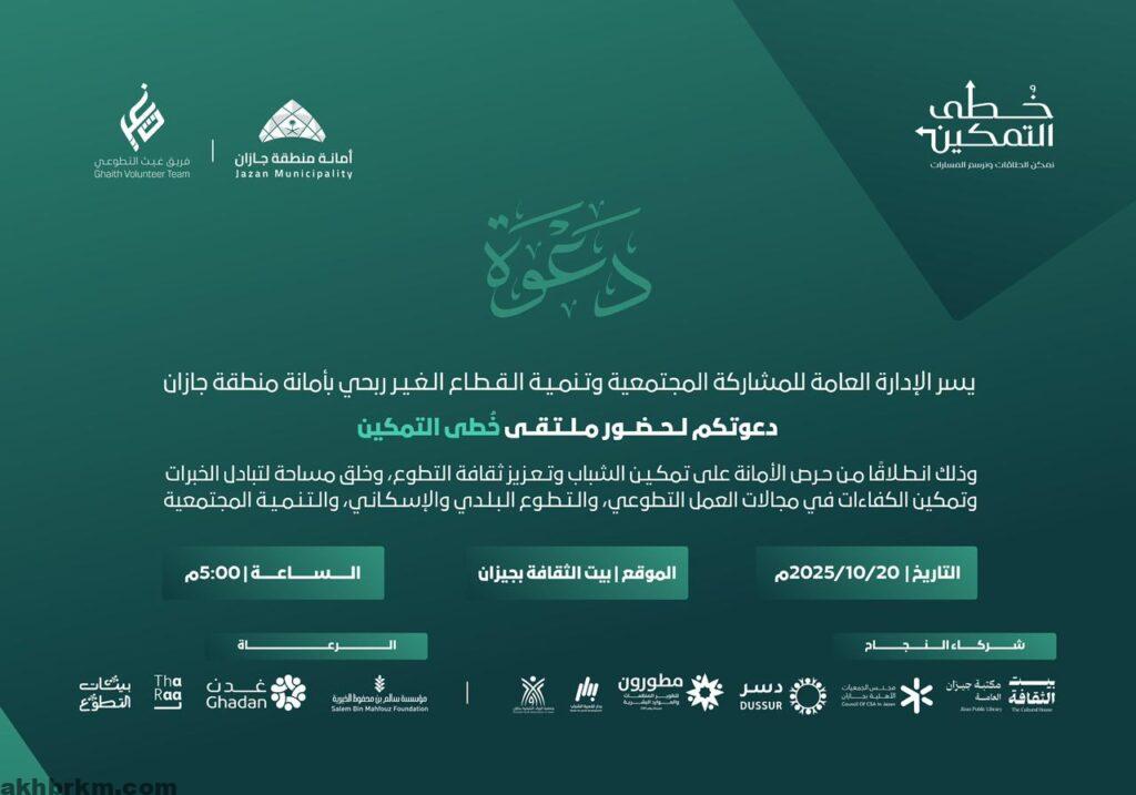 تستعد منطقة جازان لانطلاق فعاليات ملتقى “خُطى التمكين”، الذي تنظّمه أمانة منطقة جازان ممثلة بالإدارة المشاركة المجتمعية للقطاع غير الربحي، وذلك غدًا.