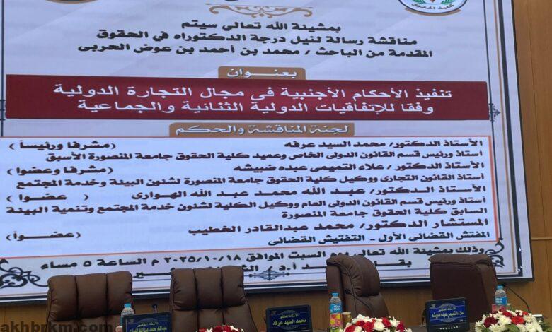الحربي ينال درجة الدكتوراه في القانون التجاري الدولي من جامعة المنصورة
