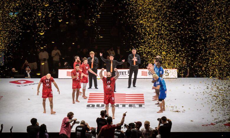 توج فريق نوجويرا دبي بلقب بطولة «كوينتيت 5» العالمية للفنون القتالية (الجرابلينج)، التي أقيمت أمس لأول مرة في الشرق الأوسط على أرض دولة الإمارات، وسط أجواء مميزة وحضور جماهيري كبير في كوكاكولا أرينا بدبي، وبمشاركة نخبة من أبرز أبطال العالم في هذه الرياضة.