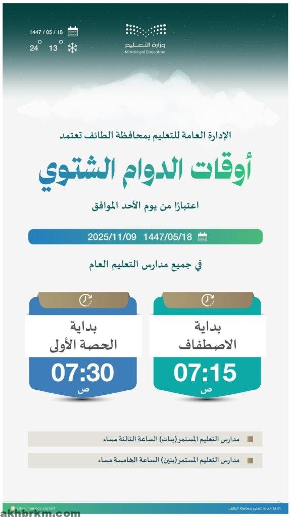 أقرت الإدارة العامة للتعليم بمحافظة الطائف موعد الدوام الشتوي للمدارس بجميع المراحل للبنين والبنات وذلك بدءًا من يوم الأحد المقبل الموافق 18 / 5 / 1447 هـ.